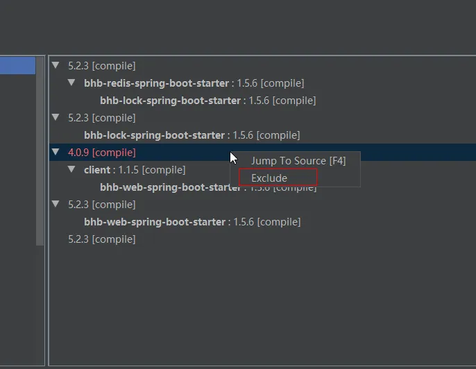 可以看到这个例子,在此项目中有两个hutool-all版本,如果项目启动失败提示跟此依赖有关的话,就可以通过右键指定版本进行排除: