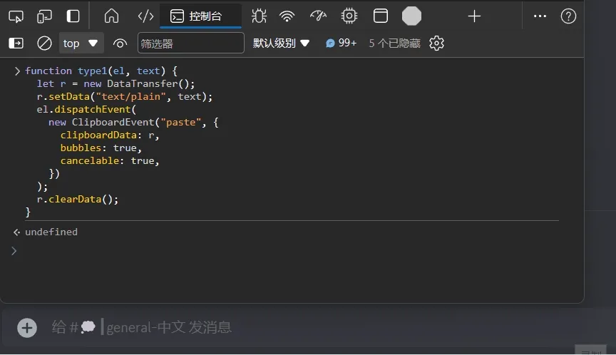/** * 方式一:下发粘贴文本事件进行输入 */function type1(el, text) { let r = new DataTransfer(); r.setData("text/plain", text); el.dispatchEvent( new ClipboardEvent("paste", { clipboardData: r, bubbles: true, cancelable: true, }) ); r.clearData();}