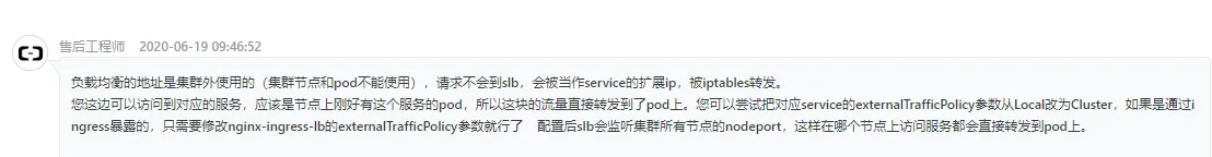按理说本地开发环境的时候使用外网域名,在部署到 k8s 的时候应该使用 k8s 内部的service域名就什么事都没有了,然而在没有强约束的情况下很多项目调用集群内部服务的时候还是使用的外网域名,然而这样可能会导致服务调用失败,没想到吧。对此我们咨询了阿里云,给我们的回答是: