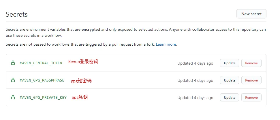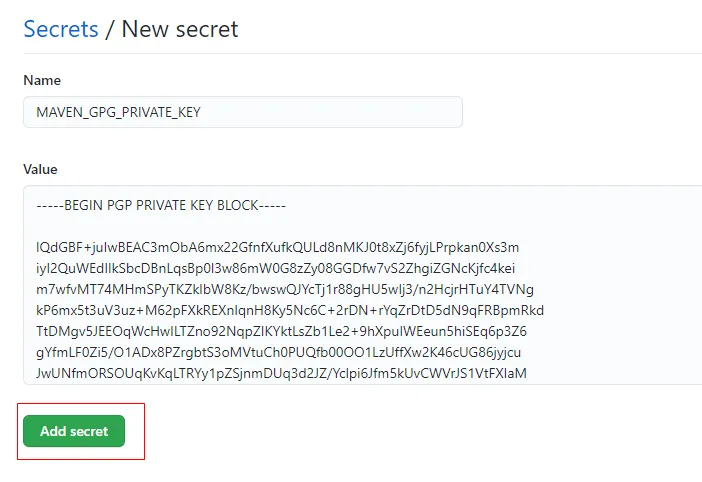 New secret按钮用于创建秘钥,将刚刚的秘钥内容创建并给定对应的名称,示例: