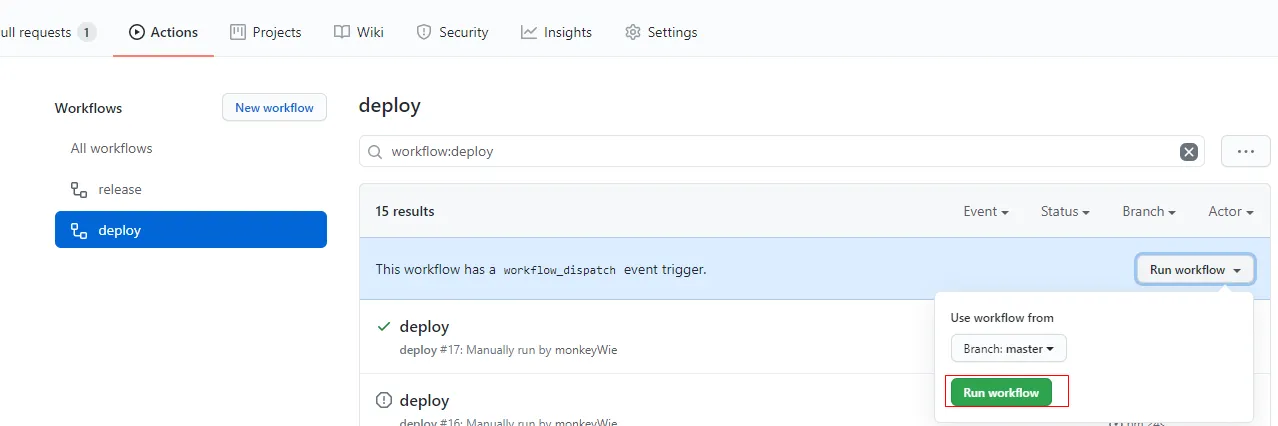 手动触发 通过 Github 可以手动的触发构建,方便测试,操作如下图: