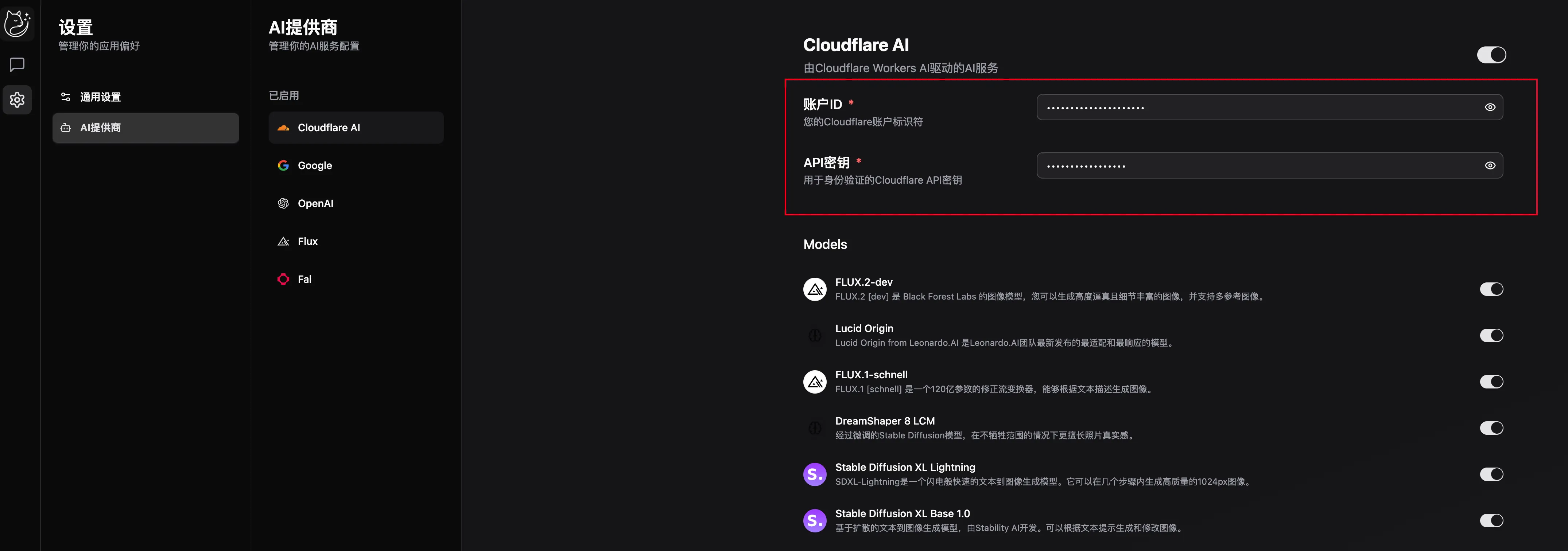 - 多模型支持 - 集成 Google、OpenAI、Flux、Fal、Cloudflare 等多种 AI 服务