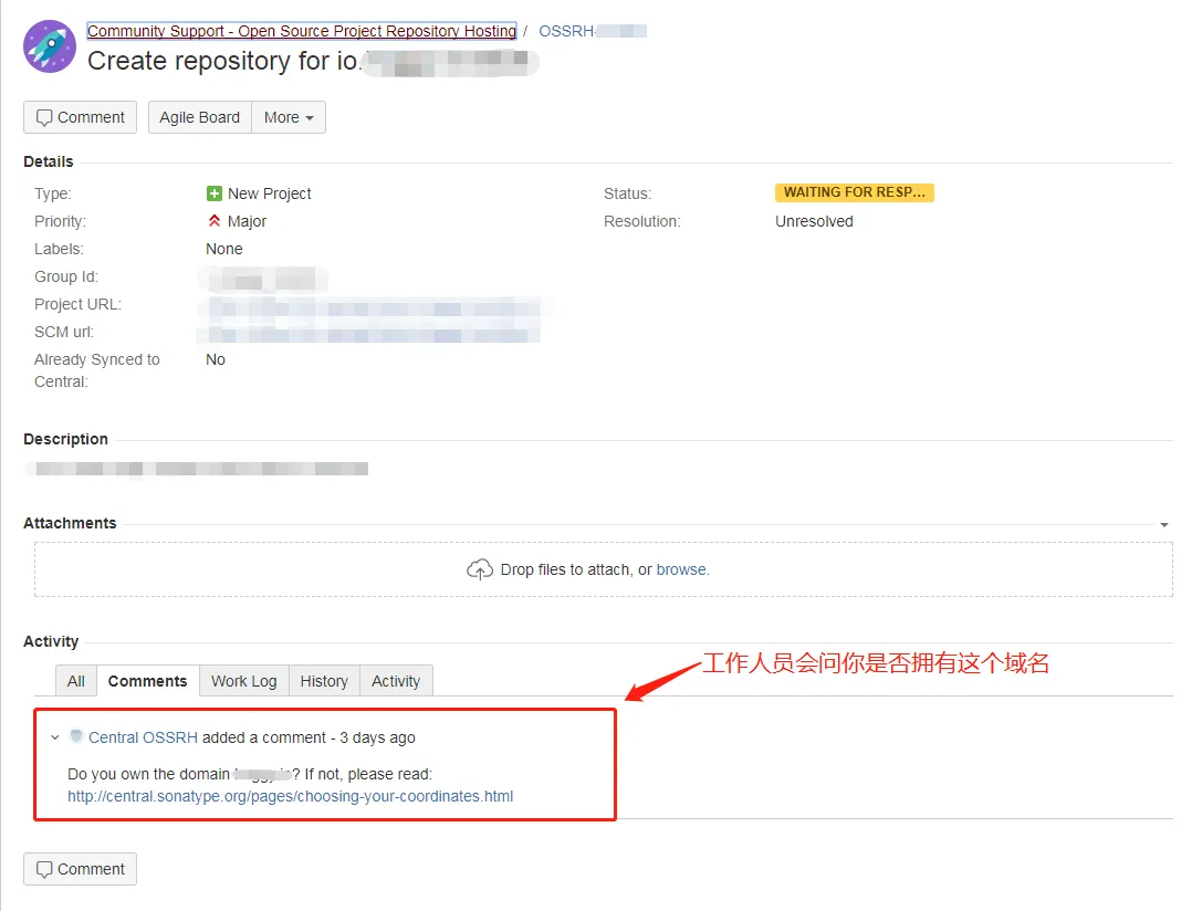 如果是用com.github.xxx的 Group Id,就回复要使用com.github.xxx作为你的域名,否则有域名就回复有就好,接着等待工作人员确认(我等了一天),确认成功之后 issue 的状态就会变成RESOLVED,这个时候就有资格上传 jar 包到 maven 仓库了。