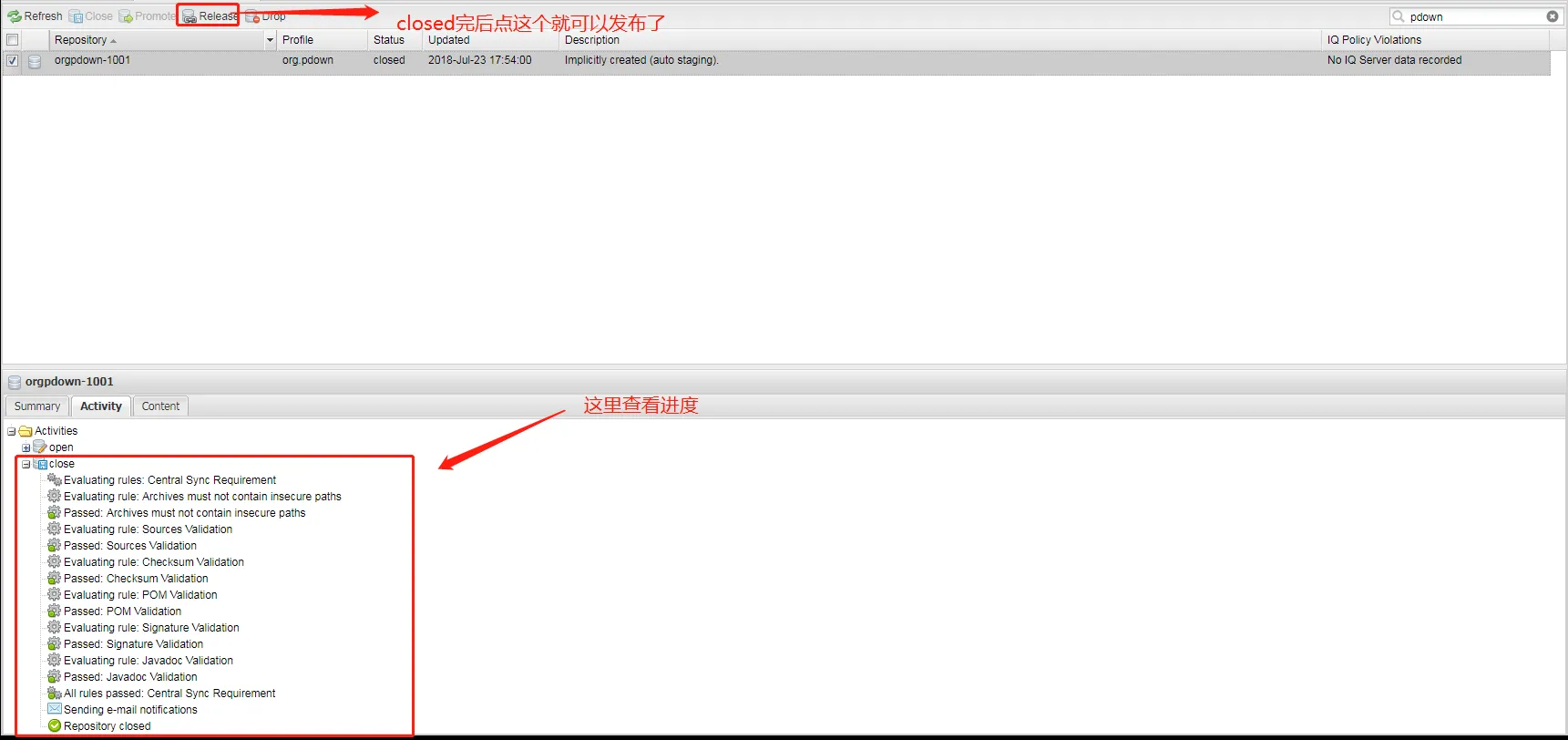 mvn clean deploy -P release -Dgpg.passphrase=YourPassphase- 如果部署成功的话使用创建 issue 的帐号登录这个网址https://oss.sonatype.org/,然后看图操作。