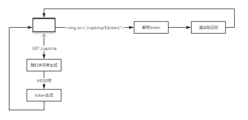 为了解决上面的问题,我想了一个解决方案,核心思想是将真实的验证码字符串存储在前端,当然是经过加密的字符串,流程图如下: