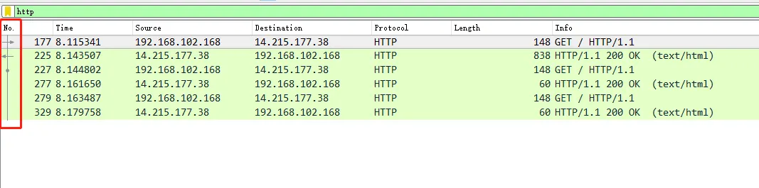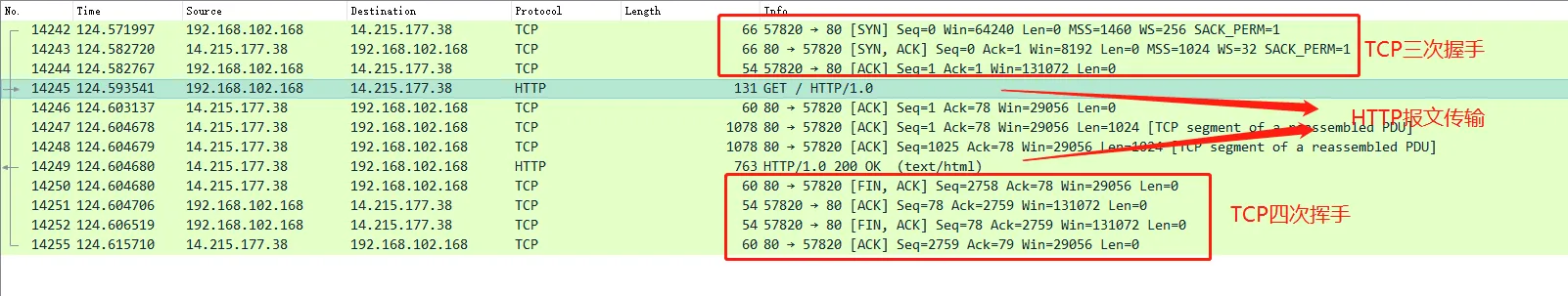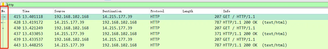 报文截图 通过第一列的连线可以观察到是同一个 TCP 连接