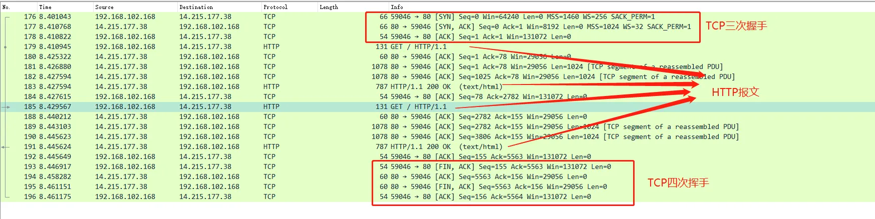 通过报文可以看到在建立了 TCP 连接之后,发生了两次 HTTP 请求之后由客户端发送FIN包关闭连接,说明这两次 HTTP 请求是在同一个 TCP 连接上进行的。