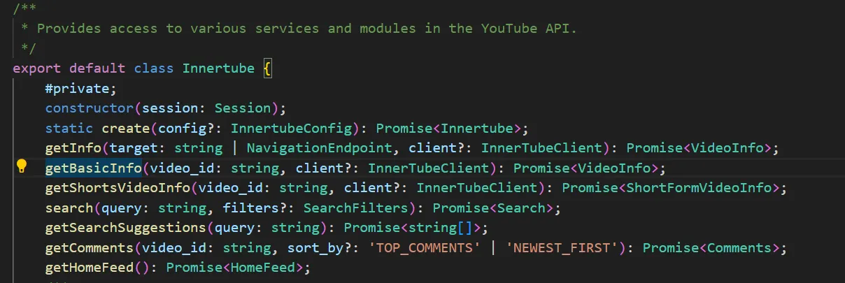 type FnReturnType = ReturnType<typeof fn>; // number是不是感觉很接近了,但是这里的fn是本地定义的一个函数,而getBasicInfo是存在于Innertube类型中的一个方法,大概长这样: