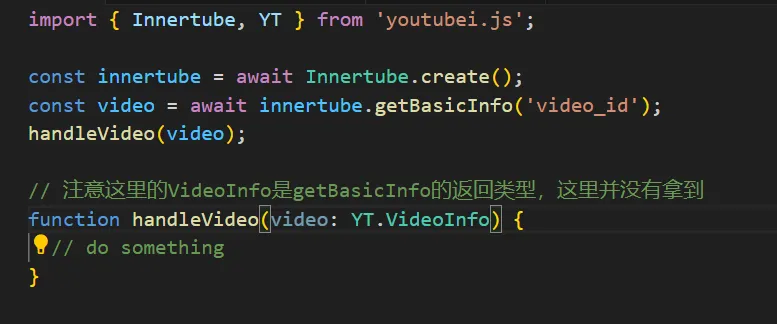 type VideoInfo = Awaited<ReturnType<Innertube["getBasicInfo"]>>;function handleVideo(video: VideoInfo) { // do something}举一反三