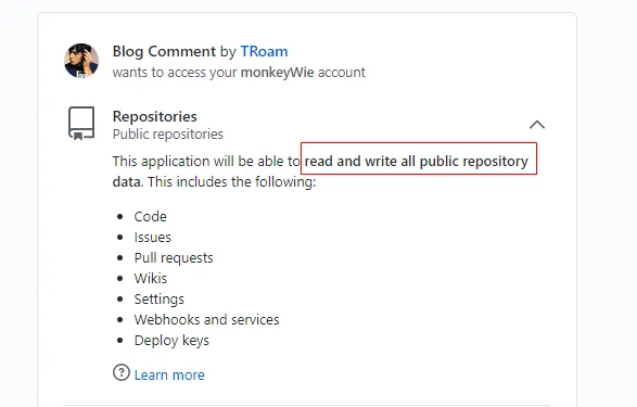 就相当于只要评论者在确认授权之后,就可以使用评论者的 github 账号来对公共仓库做任何的事情,这风险是非常高点。