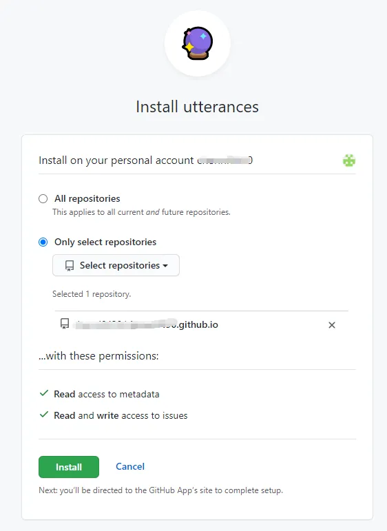 而utterances是通过Github Apps实现的,权限粒度划分的很细,可以单独对某个仓库进行授权,并且只对issues模块授权: