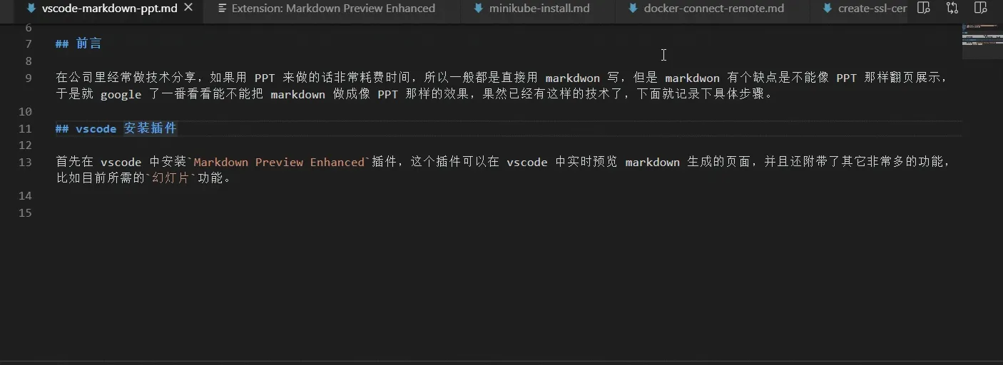 首先在 vscode 中安装Markdown Preview Enhanced插件,这个插件可以在 vscode 中实时预览 markdown 生成的页面。