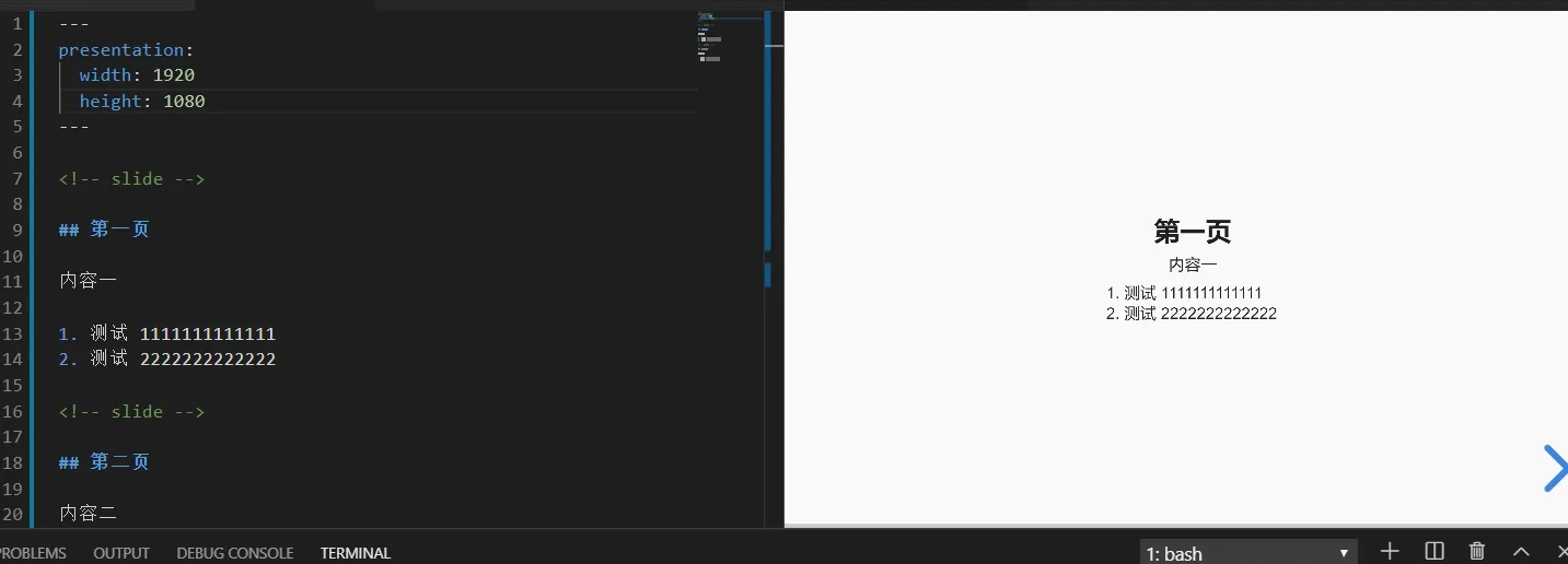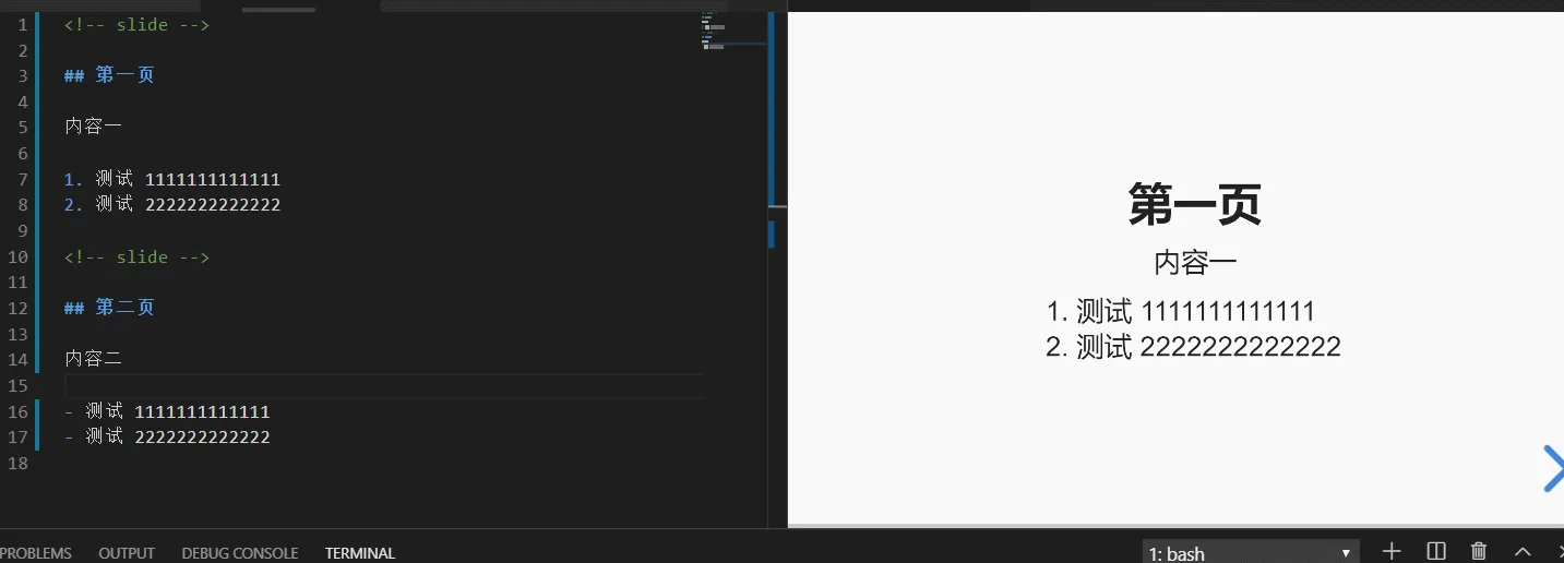 在 markdown 中只需要使用<!-- slide -->代码来标记内容为幻灯片,例如: