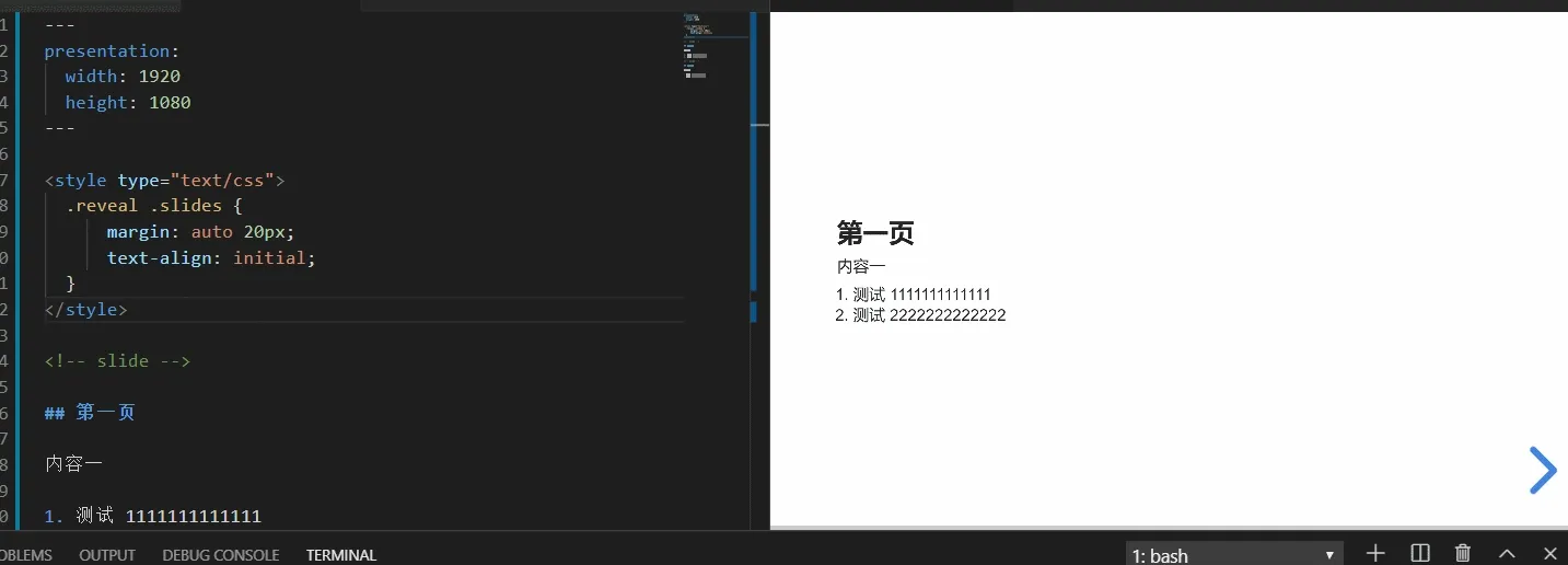 并且还附带了其它非常多的功能,比如目前所需的幻灯片功能,相关文档在这:https://shd101wyy.github.io/markdown-preview-enhanced/#/zh-cn/presentation